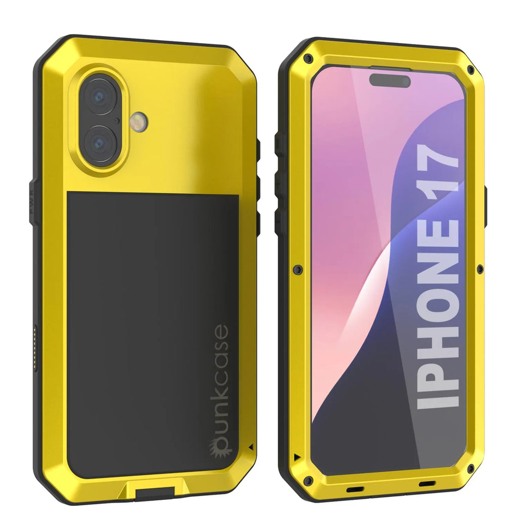 iPhone 17 Metallkoffer, Heavy Duty Military Grade Rüstungsabdeckung [Schocksicher] Ganzkörper hart [Gelb]